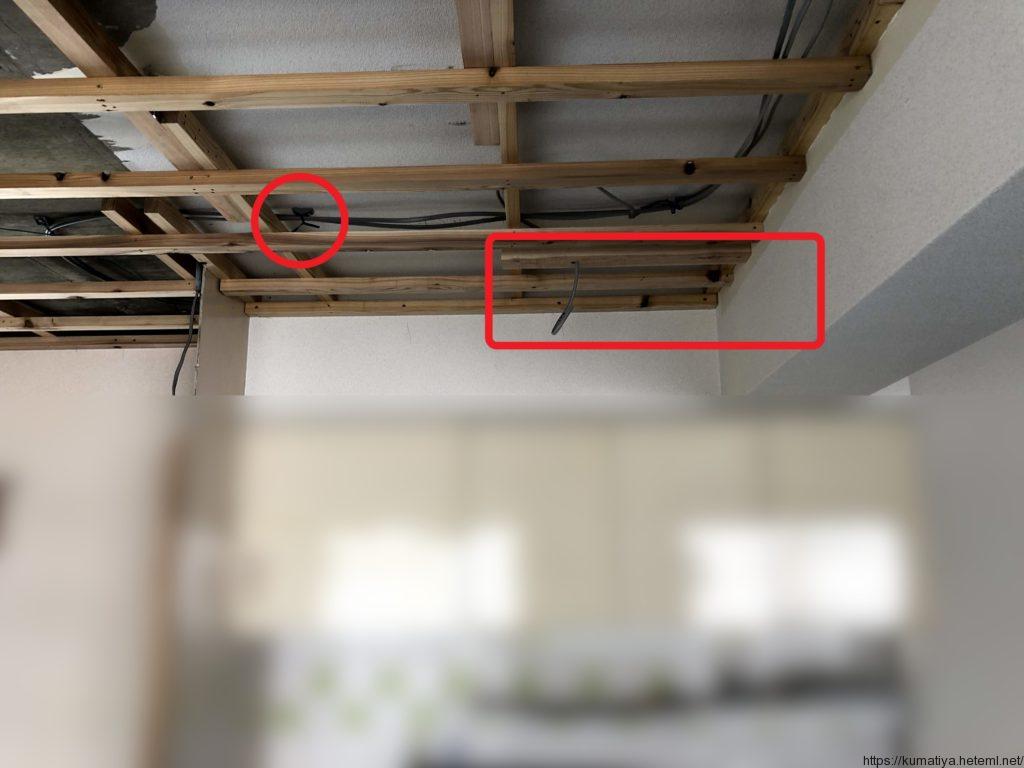 赤丸部分は、未来工業のバインドハンガーというコンクリートスラブの天井にケーブルを指示する部材です。