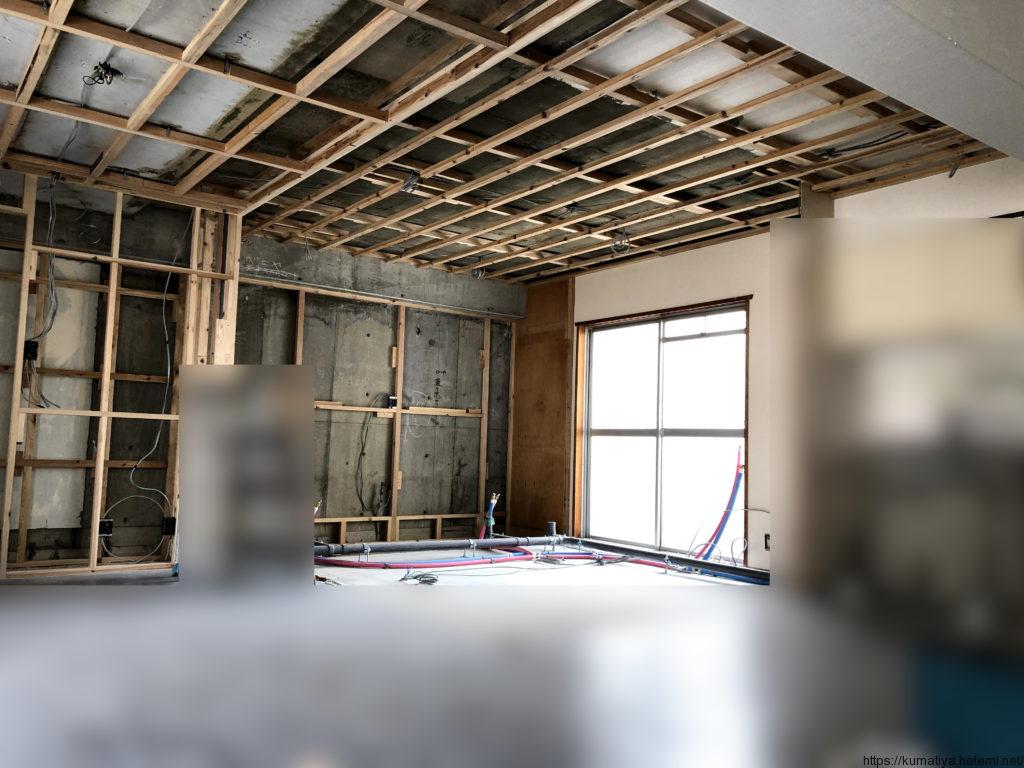 下の写真の赤の四角の所が照明器具の線を天井の下地から出している所です。大工さんから天井の下地と同じ厚みの桟木を貰って下地を取付して線を出しています。