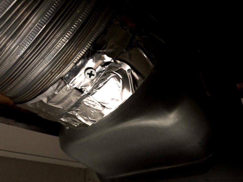 ダクトを繋いで抜け止めでビスをおまけでもんでいます。(台所だけど、アルミフレキなのか…。)