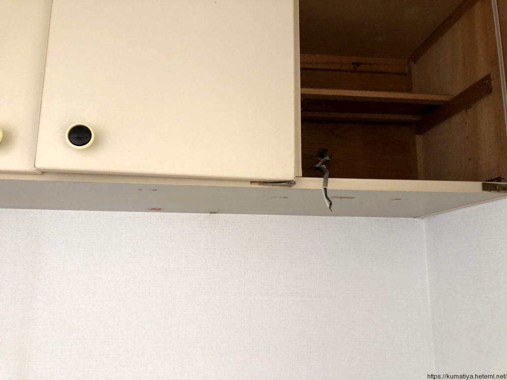 現場に到着すると既に流し元灯は取り外られていて、電線がブラブラしていました。もともと、奥に取付ていた形跡がありますが、あまり奥過ぎても使いにくいので今回は手前側に取り付けることになりました。(にしても、この吊戸棚ボロボロ・・・。)
