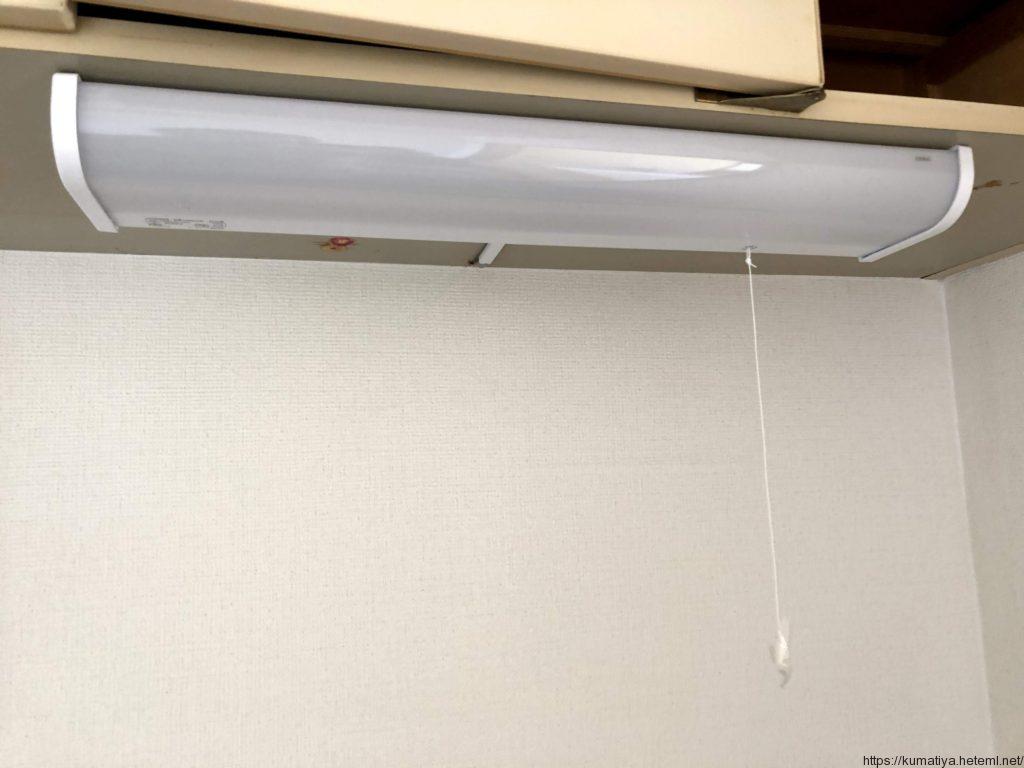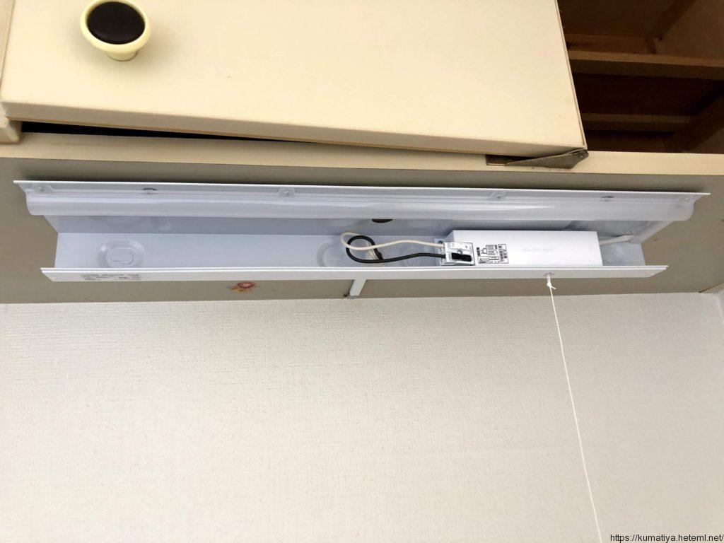 ちょっと電線が短かったので、見えないところで延長して流し元灯まで接続しました。器具の固定は付属のビスを使って、棚の底板を貫通してしまう長さじゃないことを確認してから固定します。昔はよく手持ちのビスでやって貫通してしまうヘマをしていました…。
