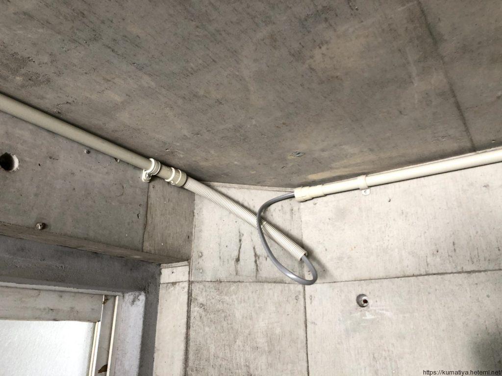 いつものように曲がりはPF管に変換して曲げます。VVF2.6-2Cなので、直線はよく通りますが、曲がりがクセが強くて一人じゃめんどくさいです・・・。天気が良いので仕事せずに、お昼寝したい・・・。
