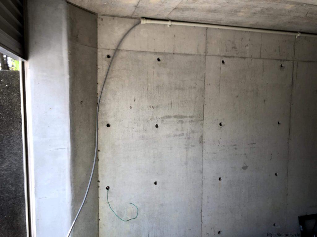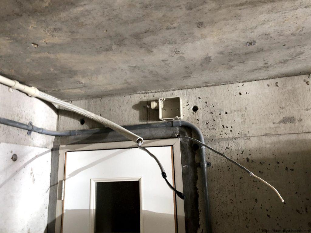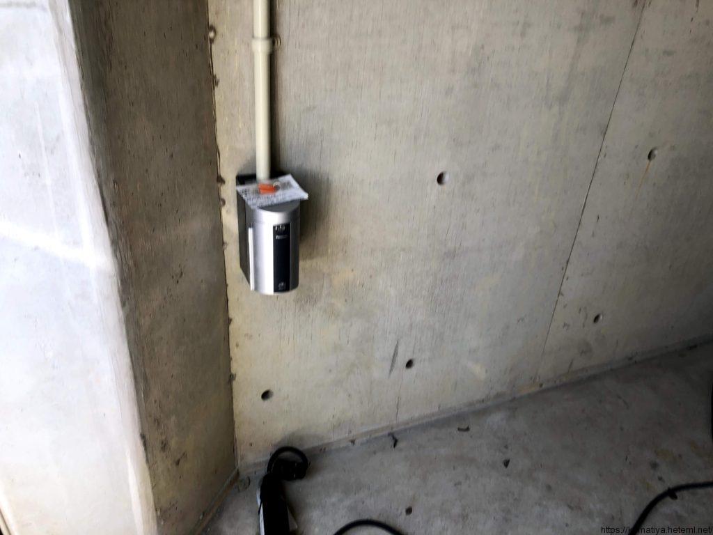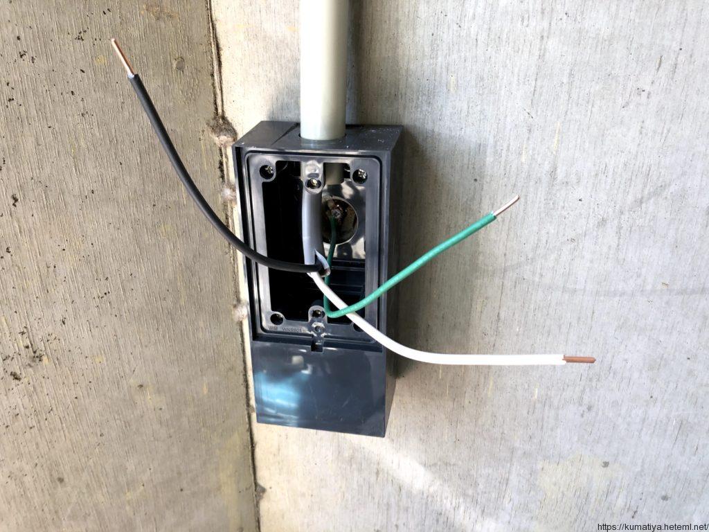 ドア枠の周りのモルタルを斫って車庫に取り込みました。配線のやり易さの為、ボックスで中継です。